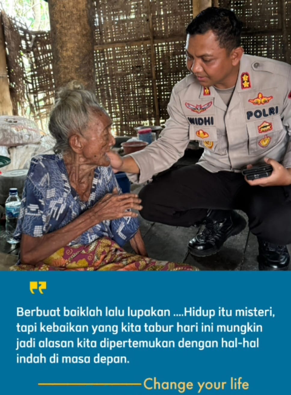 Bentuk prihatin, Kapolres menyambangi nenek Tanaloe (90) yang sudah lanjut usia dan kurang mampu yang tinggal bersama anaknya digubuk reyot warga di Lingkungan Balang, Kelurahan Balang Toa, Kecamatan Binamu, Kabupaten Jeneponto.Senin (23/06/2025)