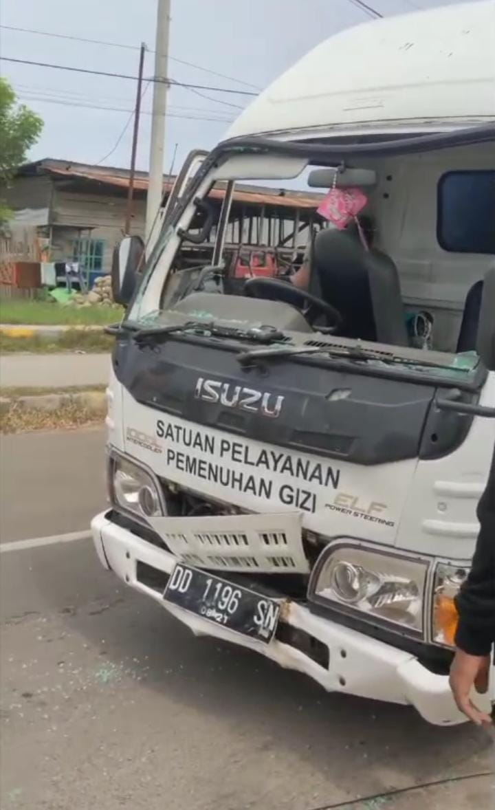 Peristiwa ini terekam camera Handphone milik salah satu warga, dan viral di media sosial (medsos), terlihat kendaraan Mobil Gizi Nasional (MGN) berwarna putih biru alami kerusakan di bagian depan.